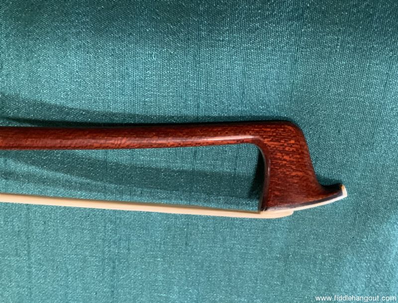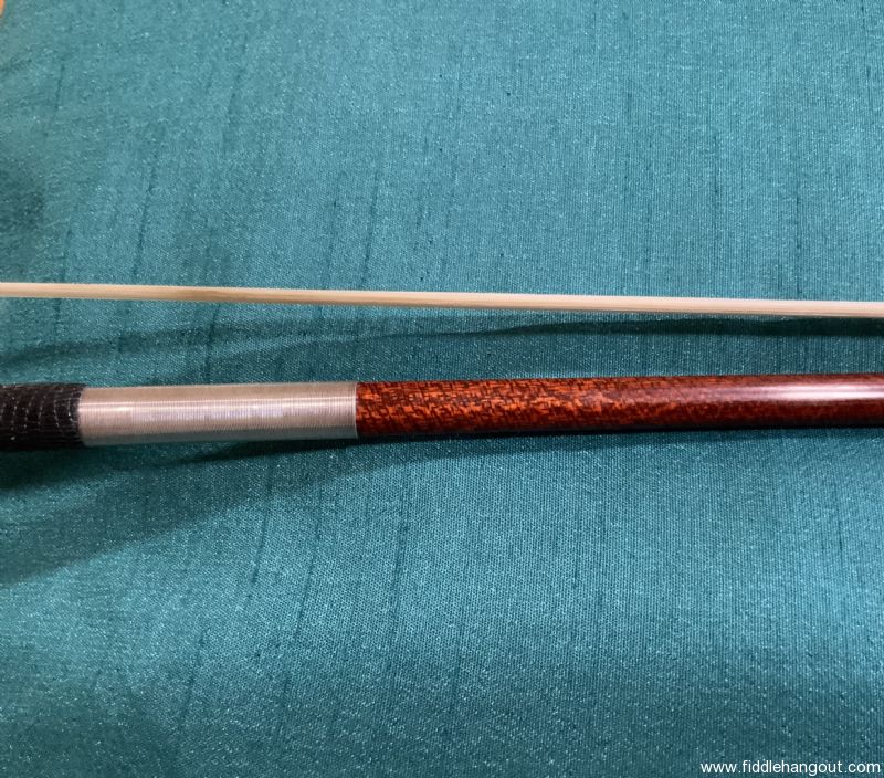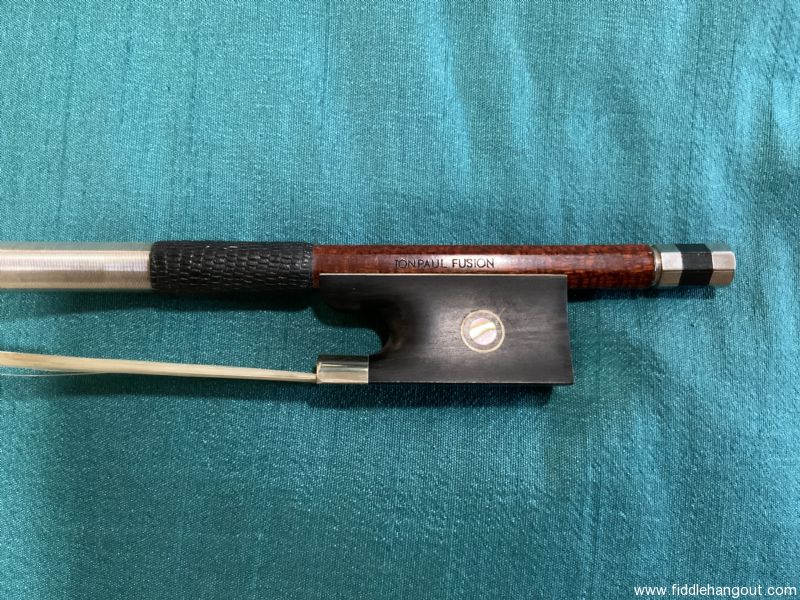 JonPaul Fusion silver mounted violin bow in nearly new condition. I bought this bow a few short months before the pandemic in 3/20 after which I fundamentally quit playing fiddle. I used this bow in the teaching studio one day a week so effectively it was used about 12 days total. It has been unused for about 5 years.This is a hybrid carbon fiber bow fused with a wood exterior. You can read all about them online. This was one of the first series of silver mounted bows with a 3 piece button. The current models appear to use a solid button to distinguish between the nickel and silver models. I really liked this bow and at their price points, I don’t know if there is anything better. 60grams weight