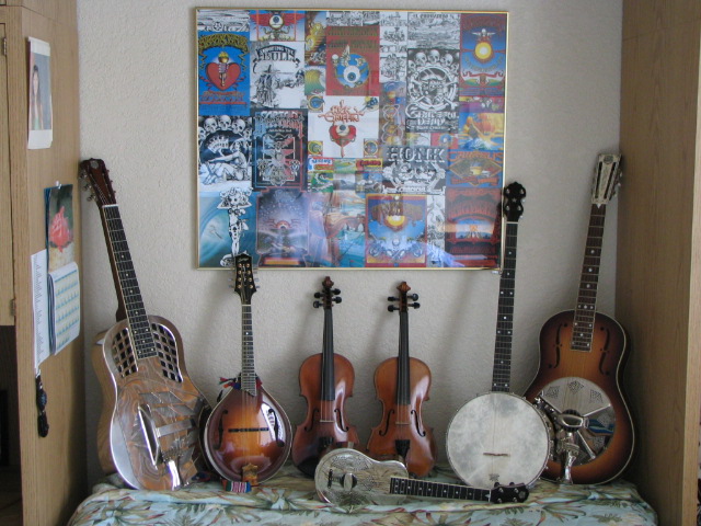 From left to right; National Style 0 Tricone (square neck), Collinngs MT-2 Mandolin, 1903 Duerr Violin, Magginni copy, Basrt Rieter Banjo, National Estrelta Deluxe, Style 3 Uke (center).
